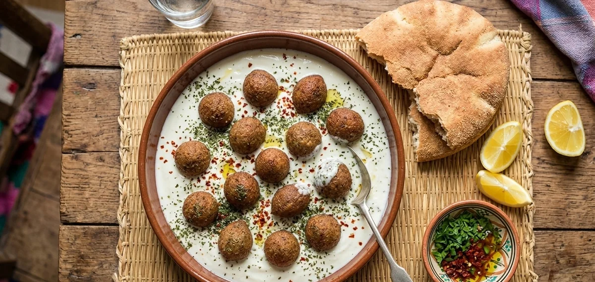 Le kibbeh labanieh (ou kibbeh bil laban) est un plat traditionnel libanais et syrien composé de boulettes de kibbeh — pâte de viande d'agneau et de boulgour fin fourrée d'une farce épicée aux pignons — mijotées dans une sauce au yaourt chaud parfumée à l'ail, à la coriandre et à la menthe.