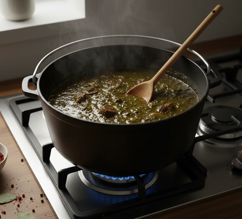 Si tu fais une pause, c'est là que les grumeaux se forment ! - Le repère de fin de cuisson que ma grand-mère m'a transmis : quand l'huile remonte à la surface, c'est que ta mloukhia tunisienne est parfaitement cuite.