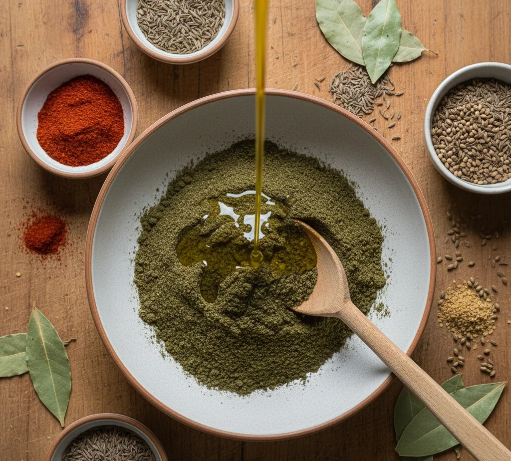 - Premier point crucial : mélange bien la poudre de molokheya avec l'huile jusqu'à obtenir une préparation homogène. 💡 Ne saute surtout pas cette étape, c'est elle qui permet d'éviter les grumeaux par la suite !