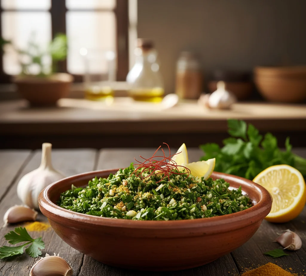 - Étape 1:Prépare d'abord ta chermoula en mettant le persil, la coriandre, l'ail écrasé dans un bol 🌿 Ajoute le jus et le zeste du citron, la paprika, le ras el hanout, l'huile d'olive, sel et poivre.
